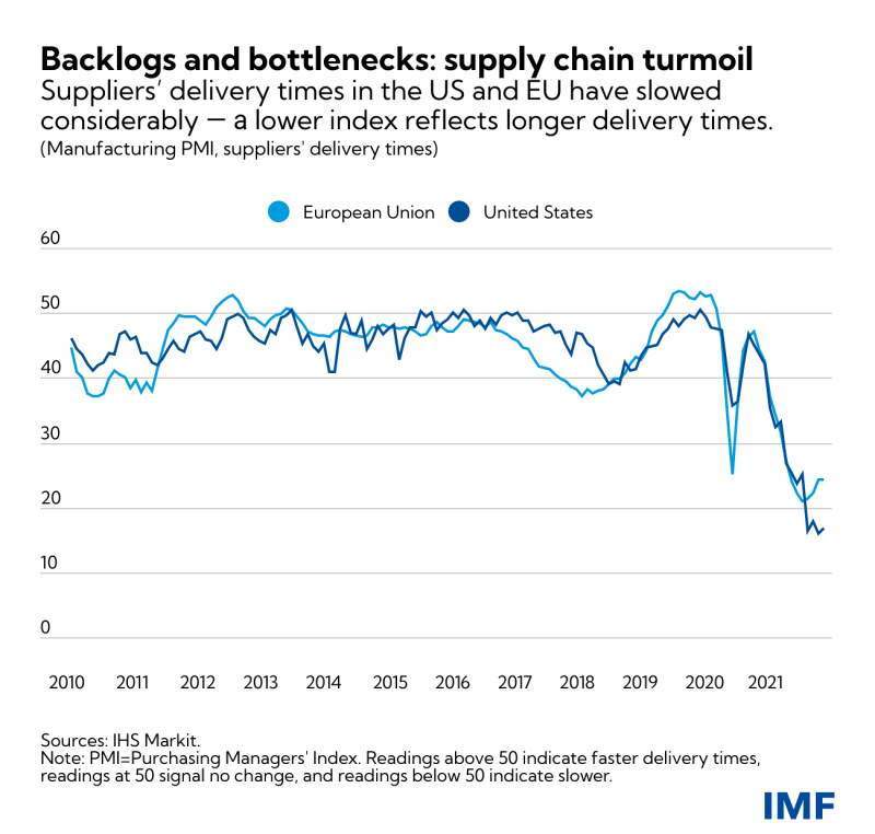 Desde el FMI explican que en «el gráfico se muestra que los tiempos de entrega de los proveedores en los Estados Unidos y la Unión Europea han alcanzado niveles récord desde finales de 2020. El índice de tiempos de entrega de los proveedores de IHS Markit se construye a partir de las encuestas comerciales del Índice de gerentes de compras y refleja el alcance de los en la cadena de suministro», destaca la nota del Fondo Monetario Internacional.