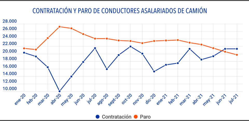 Así mismo, en julio, los datos oficiales refieren que un total de 37.710 demandantes de empleo como conductores asalariados solicitan esta ocupación en primer lugar, mientras que otros 1.592 lo hacen como autónomos.