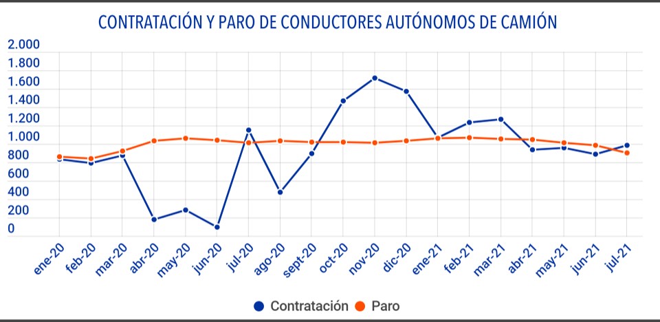Por otro lado, pese a la escasez de conductores, se impone la contratación temporal de estos profesionales. En concreto, un 80,76% de todos los contratos de trabajo suscritos para conductores asalariados de camión en julio han sido temporales, mientras que entre los autónomos, la contratación temporal alcanzaba el 91,89% del total del séptimo mes de 2021.