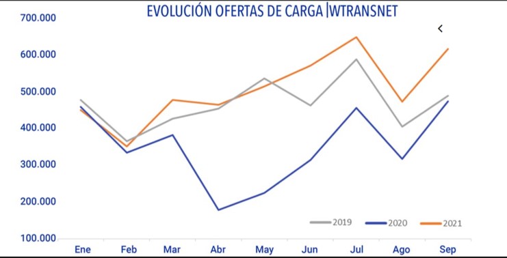 Con un aumento en las ofertas de cargas del 45% respecto a 2020 desde enero, a estas alturas del año los números superan los de 2019, antes de la pandemia, con más de 300 mil ofertas de cargas por encima de las contabilizadas hace dos años y casi un millón y medio más que las anotadas en 2020.