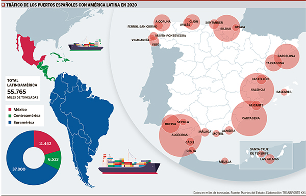 El primer puerto español por volumen de tráfico con América Latina es Algeciras. En 2020, entre las entradas y salidas, movió 10,3 millones de toneladas, el 18,5 por ciento del tráfico del conjunto de los puertos españoles con esta región, según datos facilitados por Puertos del Estado. A continuación se encuentra el puerto de Cartagena, con cerca de 8,3 millones de toneladas, seguido de Valencia (8 millones de toneladas), Bilbao (5,9 millones de toneladas) y Barcelona (5,2 millones de toneladas). Estos cinco enclaves suman un total de 37,7 millones de toneladas, lo que representa el 67,6 por ciento de los flujos entre Latinoamérica y los puertos españoles.