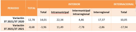 Dentro de la actividad nacional, el menor crecimiento se produce en las rutas cortas intermunicipales intrarregionales, con un 4,46% y el mayor en rutas intramunicipales (DUM) con un 22,34 %.