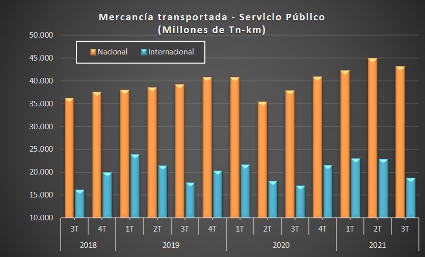 Según recoge la última encuesta permanente del transporte de mercancías por carretera que elabora el Ministerio de Fomento, en el tercer trimestre de 2021 el servicio público ha transportado un total de 61.714,93 millones de toneladas-kilómetro, un 12,78 % más que el mismo periodo de 2020 (54.721,52 millones de toneladas-kilómetro).