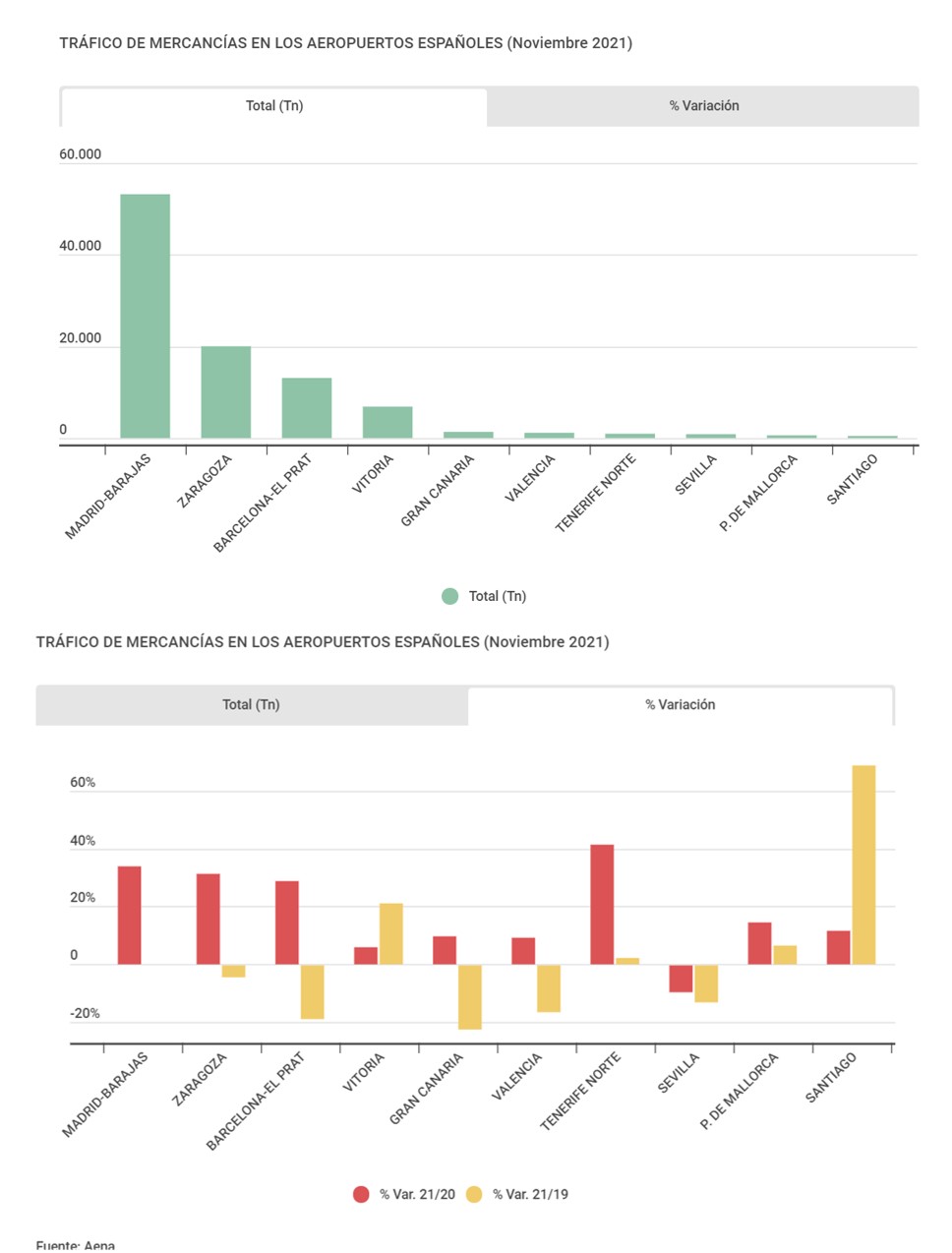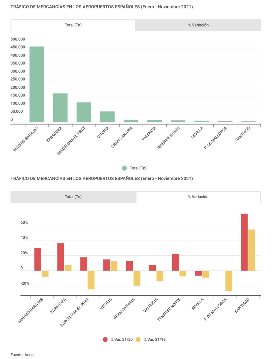 Respecto a los datos acumulados, Zaragoza y Vitoria no arrojan novedades porque vuelven a ser las dos infraestructuras que registran datos en positivo, con un aumento del 7,1% y del 12,3%, respectivamente, en volumen de carga de enero a noviembre de 2021 con respecto al mismo periodo de 2019. Estos porcentajes se traducen en un total de 178.605 toneladas y 66.283 toneladas, respectivamente. Por lo demás, Madrid-Barajas recupera datos y recorta la caída hasta el 7,5% (470.713 toneladas), mientras que Barcelona-El Prat aminora ligeramente su desplome y pasa a registrar el 24,2% menos (122.432 toneladas).