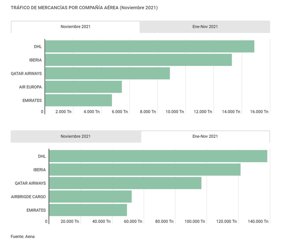 Respecto al volumen por aerolíneas, DHL vuelve a situarse como primera con un total de 13.408 toneladas, seguida de Iberia, que sin embargo, pierde posiciones con respecto al mes pasado y ha pasado a gestionar 13.276 toneladas. También pierde posiciones Emirates respecto a Air Europa, que gestionaron, respectivamente, 4.752 toneladas y 5.455 toneladas en noviembre.
