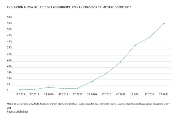 Alphaliner ha destacado que los márgenes operativos de las diez principales navieras que publican resultados se han acelerado en el tercer trimestre de 2021, con un ratio medio que ha alcanzado el 56%. Este margen operativo fue del 3,7% en el mismo periodo de 2019. La consultora ha subrayado que, tras la publicación de los resultados del tercer trimestre, “las diez principales navieras de contenedores que presentan cifras públicas podrían estar en camino de registrar unos beneficios operativos de entre 130.694 millones de euros y 136.376,4 millones de euros por sus actividades de transporte marítimo en 2021, más de seis veces la cantidad de 2020”. La predicción “se basa en los beneficios derivados de las previsiones de las empresas junto con las propias estimaciones de Alphaliner”. “Las 10 compañías”, ha añadido la consultora, “ya han generado cerca de 90.917,6 millones de euros de EBIT entre el primer y el tercer trimestre, mientras que la reciente aparición de la variante Ómicron podría elevar aún más estas previsiones”.