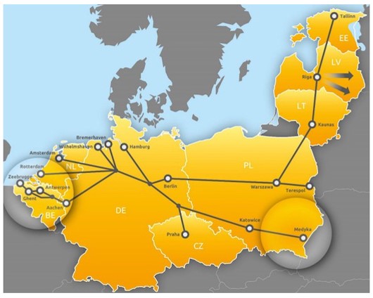 El corredor ferroviario de mercancías Mar del Norte – Báltico, RFC NS-B, se ha ampliado hasta Medyka, en Polonia, y los puertos de Gante y Zeebrugge, en Bélgica, como línea principal y hasta el puerto de Terneuzen, en los Países Bajos, como línea de conexión.
