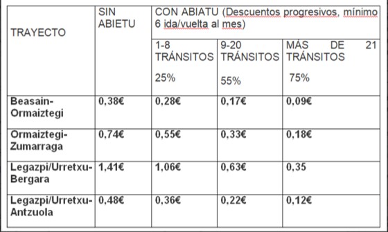 La diputada de Infraestructuras Viarias, Aintzane Oiarbide, afirma que el dispositivo Abiatu es el único que da derecho a obtener descuentos: «Del 25% al 75%, en función del número de trayectos que se hagan al mes. Además, tendrá un tope de gasto de 33,37 euros al mes en las autopistas de Gipuzkoa, 49,30 euros en la AP-8 en Bizkaia y en la AP-1 en Araba», concluye.