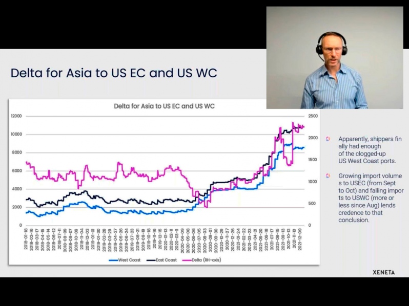 A modo de reflexión sobre las tendencias del 2021, el analista destacó el alcance global de las repercusiones en una red integrada en la ruta transpacífico al este, con más de 10% de la capacidad atada a retrasos. Otro evento disruptivo digno de destacar por el cual el 2021 será recordado es el encallamiento del «Ever Given» en el canal de Suez: «[el Ever Given] hizo conocida a la industria del shipping al ciudadano común, poniendo el foco en la cadena de suministro que nos hace la vida tan fácil a todos nosotros en todos lados«, dijo Sand, enfatizando que aun cuando el bloqueo fue superado y el tránsito volvió a sus tiempos normales en unas pocas semanas, la notoriedad de la cadena de suministro se mantuvo durante todo el resto del año. Más tarde durante el segundo semestre, los puertos de los Ángeles y Lobg Beach (LA-LB) se tomaron el foco con las largas filas de buques esperando atracar para descargar, seguido de problemas de conexión en tierra causados por falta de conductores, almacenes y bodegas llenas y otras deficiencias de la cadena de suministro que se hicieron evidentes con la pandemia.