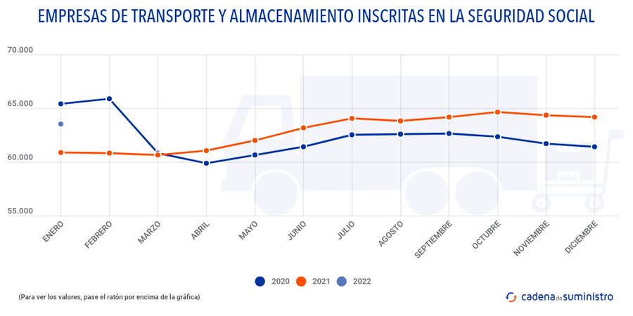 El número de empresas de transporte y almacenamiento inscritas en la Seguridad Social inicia 2022 a la baja, como terminó 2021.