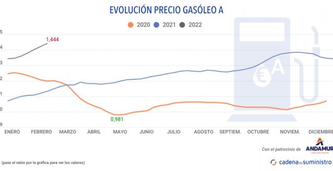 11/02/2022 CdS El precio del gasóleo se ha incrementado en un 1,54% entre el 1 y el 7 de febrero, alcanzando los 1,444 euros, según los datos proporcionados por el Boletín Petrolero…