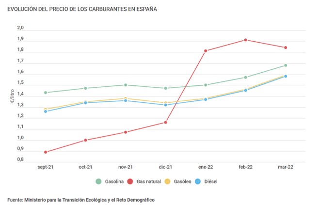 El gasóleo cuesta ya el 70% más que en enero de 2021 y el 35% más que en enero de este año, según el ministerio para la Transición Ecológica. Por su parte, el precio medio de la electricidad está en 346,6 euros el megavatio/hora en lo que llevamos de 2022. El año pasado terminó con una tarifa de 111,9 euros el megavatio/hora, según el Operador del Mercado Ibérico de Energía (OMIE). También el precio del gas está desbocado. Esta coyuntura, según denuncian todos los sectores de actividad logística y de transporte, compromete sus actividades en mayor o menor medida, dependiendo de la fuente de energía que utilicen y del segmento en el que operen.