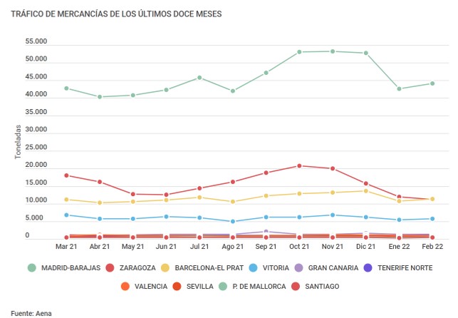 En términos generales, 2021 fue un año de grandes fluctuaciones en la carga aérea en España, siendo los meses de febrero, abril, mayo y agosto los que mayores descensos experimentaron en los tres principales aeródromos (Madrid-Barajas, Zaragoza y Barcelona-El Prat). Por su parte, el Aeropuerto de Vitoria mantuvo cierta estabilidad a lo largo de todo el ejercicio, registrando un mayor descenso de toneladas transportadas en agosto y los aeropuertos de Tenerife y Valencia han ido disputándose el sexto y séptimo puesto durante los 12 meses siempre en torno a las mil toneladas transportadas. Aunque los aeropuertos españoles iniciaron el 2022 con cifras inferiores a las prepandémicas, la recuperación del mes de febrero ha reactivado el movimiento por encima de 2019. Los que más destacan en febrero son Tenerife (+50,8%); Gran Canaria (+38,5%) y Barcelona, que crece el 26,7% respecto al mismo mes de 2021.
