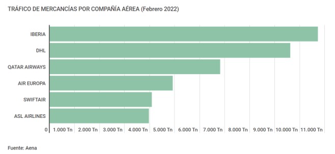 Desglosando por compañías aéreas, Iberia encabeza el ranking con 10.725 toneladas en febrero. DHL pasa a la segunda posición con 9.620 toneladas movidas en febrero de 2022 y Qatar Airways alcanza el tercer puesto con 6.816 toneladas. No obstante, Emirates continúa en la séptima posición con 3.907 toneladas, superada por Air Europa, Swiftair y ASL Airlines.