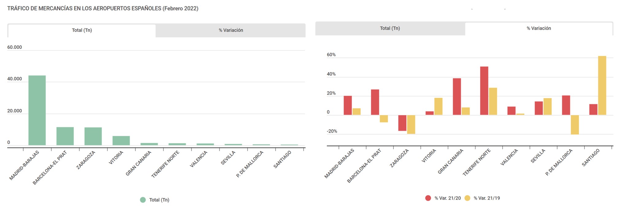 En términos generales, 2021 fue un año de grandes fluctuaciones en la carga aérea en España, siendo los meses de febrero, abril, mayo y agosto los que mayores descensos experimentaron en los tres principales aeródromos (Madrid-Barajas, Zaragoza y Barcelona-El Prat). Por su parte, el Aeropuerto de Vitoria mantuvo cierta estabilidad a lo largo de todo el ejercicio, registrando un mayor descenso de toneladas transportadas en agosto y los aeropuertos de Tenerife y Valencia han ido disputándose el sexto y séptimo puesto durante los 12 meses siempre en torno a las mil toneladas transportadas. Aunque los aeropuertos españoles iniciaron el 2022 con cifras inferiores a las prepandémicas, la recuperación del mes de febrero ha reactivado el movimiento por encima de 2019. Los que más destacan en febrero son Tenerife (+50,8%); Gran Canaria (+38,5%) y Barcelona, que crece el 26,7% respecto al mismo mes de 2021.