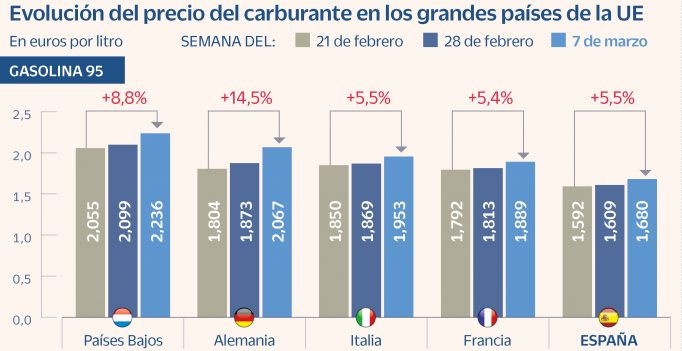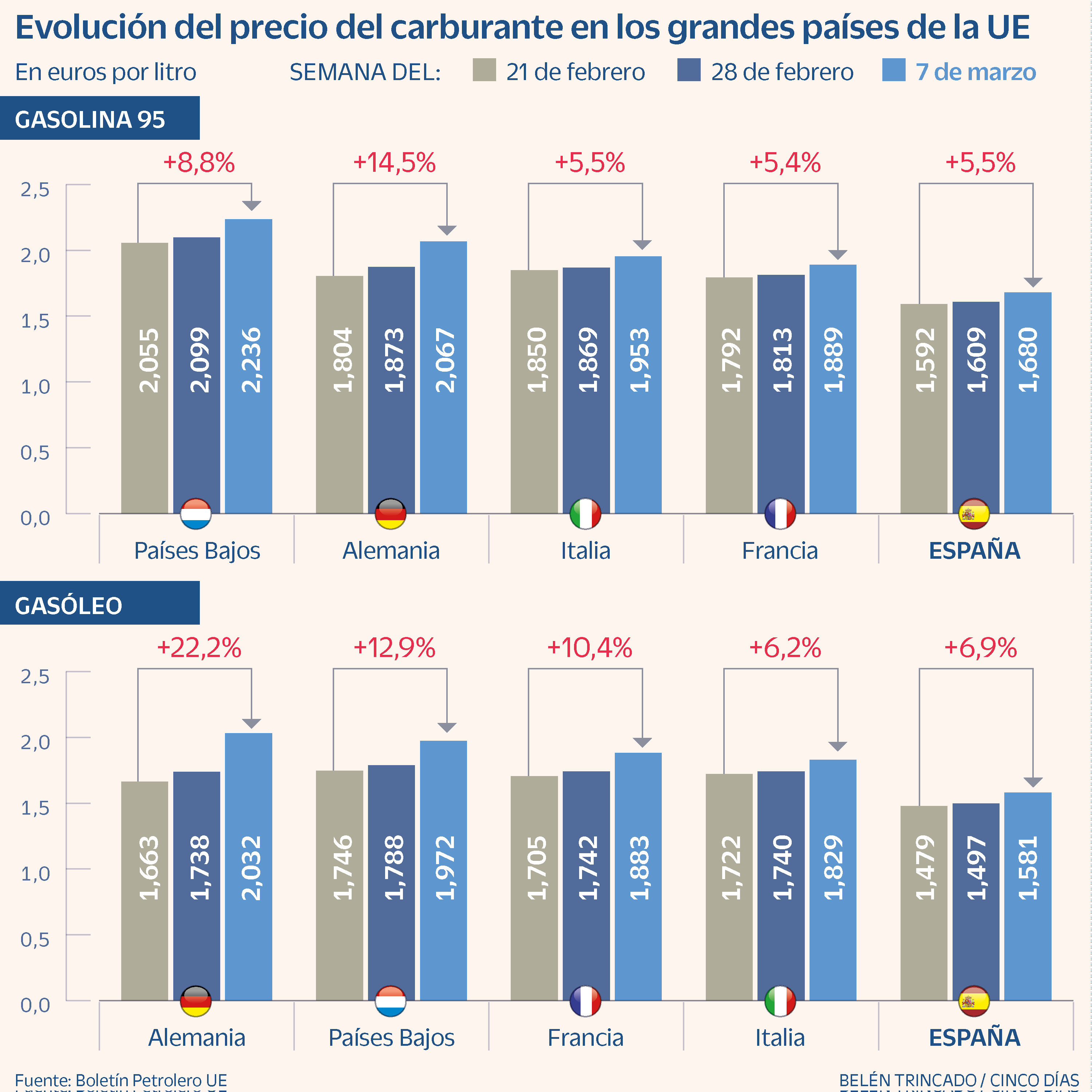 Los datos del Boletín Petrolero de la UE, actualizados hasta la semana iniciada el 7 de marzo, reflejan que el país más afectado por el encarecimiento ha sido Alemania, en el que el precio del litro de la gasolina y el gasóleo ya supera los dos euros. En esas tres semanas, el coste de la gasolina se ha incrementado un 14,5%, mientras que el del gasóleo se ha incrementado un 22,2%. De hecho es el único país entre los 19 de la zona euro en el que el precio del carburante supera los dos euros por litro tanto para la gasolina (2,06 euros) como para el diésel (2,03). Si el análisis se amplia a los 27 países de la UE, aparece otro país (Finlandia), en el que el precio de ambos carburantes supera la barrera de los dos euros.