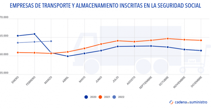 Durante el pasado mes de marzo se mantiene el incremento en el número de empresas de transporte y almacenamiento inscritas en la Seguridad Social que ya se percibía en febrero.