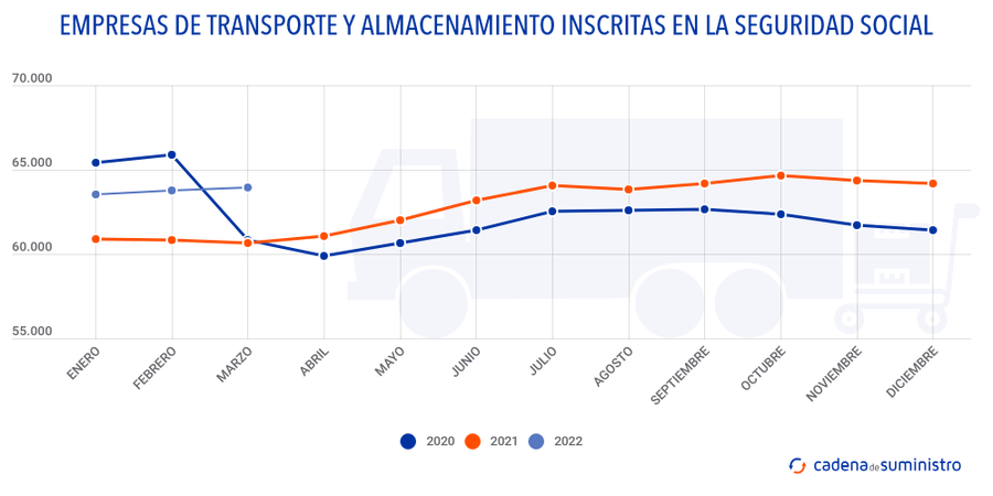 Durante el pasado mes de marzo se mantiene el incremento en el número de empresas de transporte y almacenamiento inscritas en la Seguridad Social que ya se percibía en febrero.