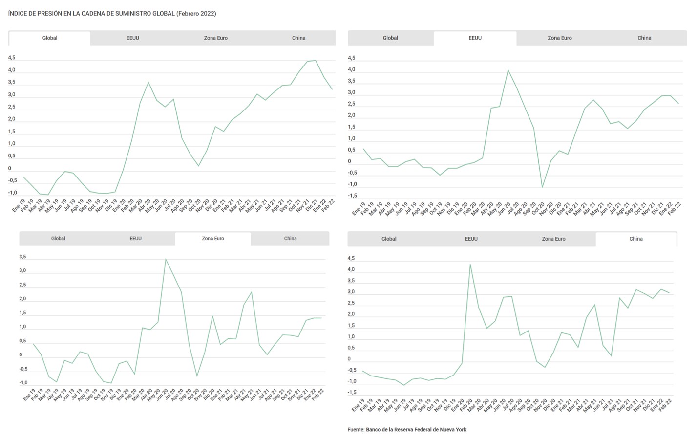 LA PRESIÓN SOBRE LA CADENA DE SUMINISTRO DECRECE, PERO SIGUE SIENDO ALTA Con la intención de medir la tensión en la cadena de suministro mundial y su impacto en la actividad, el Banco de la Reserva Federal de Nueva York publicó el pasado mes de enero el Índice de Presión en la Cadena de Suministro Global (GSCPI por sus siglas en inglés), que mide y combina los datos de los costes del transporte marítimo y del transporte aéreo para los vuelos de carga entre Asia, Europa y Estados Unidos. También emplea parámetros como los plazos de entrega, los retrasos y las compras para empresas de China, la Zona Euro, Japón, Corea del Sur, Taiwán, Reino Unido y Estados Unidos. Todos los datos provienen de organismos e índices internacionales. Según los últimos datos recogidos por la Reserva Federal hasta febrero de 2022, el GSCPI apunta a una relajación de las presiones de la cadena de suministro mundial desde diciembre de 2021, aunque se mantienen en niveles históricamente altos. Según el mecanismo, la tensión de la supply chain global alcanzó su punto máximo en diciembre de 2021, mientras que en años anteriores, las presiones alcanzaron los niveles más altos en noviembre. “Existe la posibilidad de que el actual aumento de las tensiones geopolíticas provoque presiones más elevadas en la cadena de suministro en un futuro próximo”, adelantan los expertos que han puesto en marcha el GSCPI.