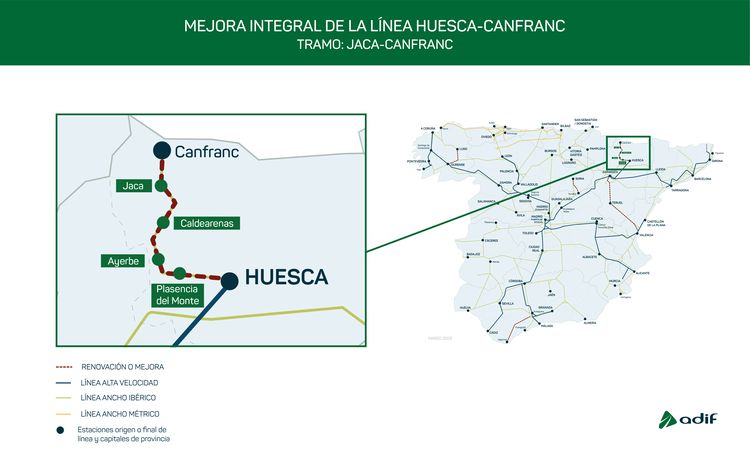 Adif ha licitado el contrato para la mejora integral del tramo Jaca-Canfranc, por importe de 30.990.891 euros y con un plazo de ejecución de diez meses. Esta actuación supone un nuevo impulso al Plan de Mejora y Adaptación para el Tráfico Internacional de la línea Huesca-Canfranc.
