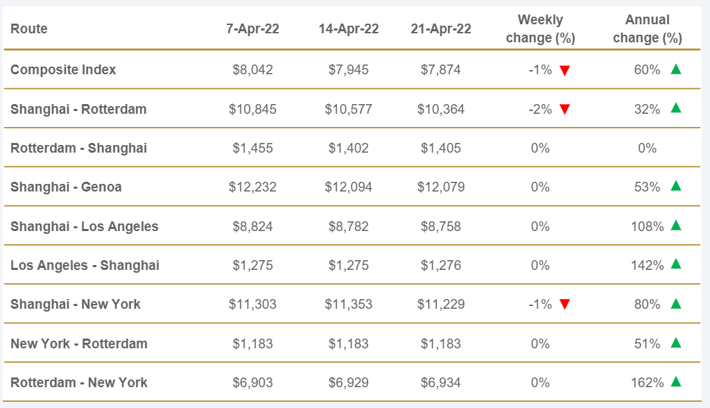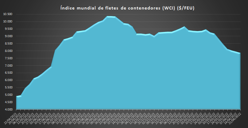 Por su parte, el World Container Index (WCI), que evalúa el coste de los fletes en la principales rutas hacia y desde Estados Unidos, se sitúa en 7.874,43 dólares por contenedor de 40 pies, lo que supone un 0,9% menos que la semana anterior, pero una subida del 60,3% respecto al año pasado.