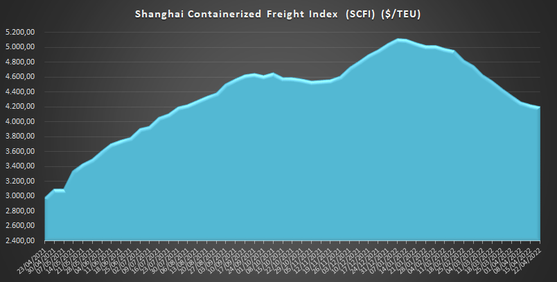 Con un valor de 4.195,98 $/TEU, los fletes desde Shanghái marcan hoy un descenso del 1,6% respecto a la semana anterior y encadenan ya quince semanas de bajadas. No obstante se mantiene un incremento del 40,8% en comparación con el mismo periodo de 2021.
