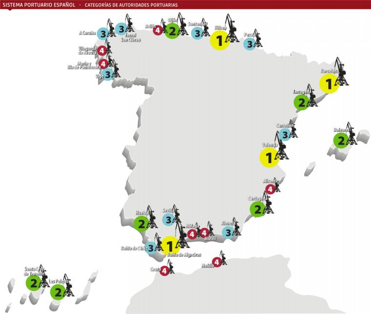 En función de este sistema de clasificación en la actualidad forman parte del Grupo 1 las autoridades Portuarias de Bahía de Algeciras, Barcelona, Bilbao y Valencia; Grupo 2: Baleares, Cartagena, Gijón, Huelva, Las Palmas, Tarragona y Santa Cruz de Tenerife; Grupo 3: A Coruña, Almería, Bahía de Cádiz, Castellón, Ferrol-San Cibrao, Pasaia, Santander, Sevilla y Vigo; y Grupo 4: Alicante, Avilés, Ceuta, Málaga, Marín y Ría de Pontevedra, Melilla, Motril y Vilagarcía de Arousa.