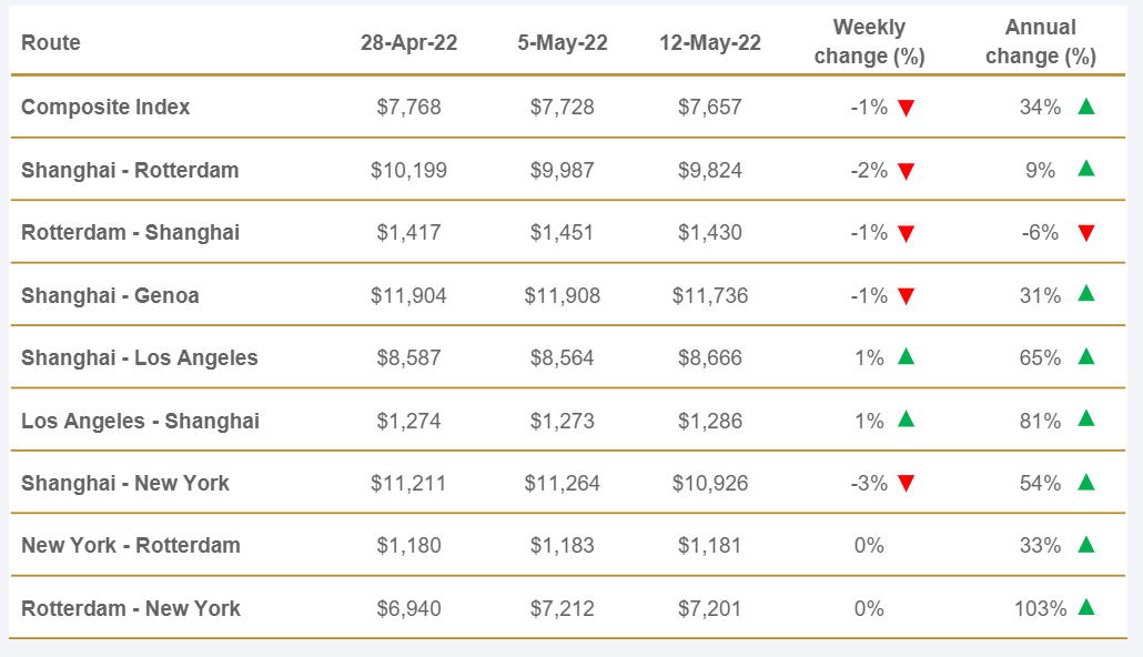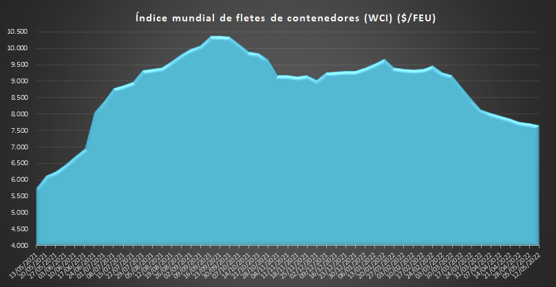 Por su parte, el World Container Index (WCI), que evalúa el coste de los fletes en la principales rutas hacia y desde Estados Unidos, se sitúa en 7.657,20 $ por contenedor de 40 pies, lo que supone un 0,9% menos que la semana anterior, pero una subida del 33,7% respecto al año pasado.