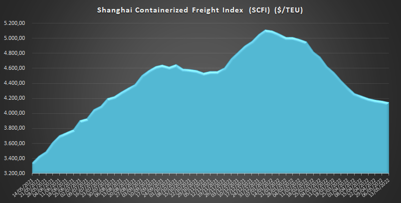 Con un valor de 4.147,83 $/TEU, los fletes desde Shanghái marcan hoy un descenso del 0,71% respecto a la semana anterior y encadenan casi cuatro meses de bajadas. No obstante se mantiene un incremento del 24,1% en comparación con el mismo periodo de 2021.
