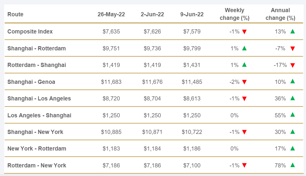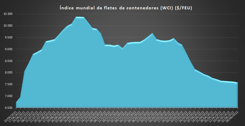 Por su parte, el World Container Index (WCI), que evalúa el coste de los fletes en la principales rutas hacia y desde Estados Unidos, se sitúa en 7.578,65 $ por contenedor de 40 pies, lo que supone un 0,6% menos que la semana anterior y una subida del 12,7% respecto al año pasado.