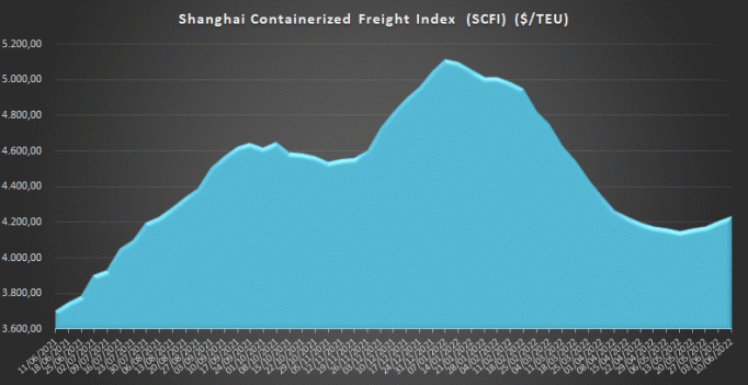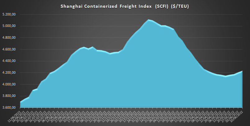 Con un valor de 4.233,31 $/TEU, los fletes desde Shanghái marcan hoy una subida del 1,4% respecto a la semana anterior, continuando la tendencia ascendente que se inició desde la reanudación de actividades en el puerto de Shanghái. Los datos reflejan un incremento del 14,3% en comparación con el mismo periodo de 2021.