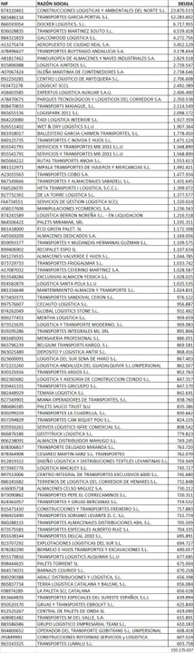Entre las empresas del sector logístico, entendido como toda la cadena de suministros (logística, transporte, distribución, almacenamiento y sectores proveedores de productos y servicios afines), el listado que acompañamos más abajo incluye –salvo error u omisión- 94 empresas (1,33 por 100 del total), que acumulan una deuda conjunta de 155.175.037 €.