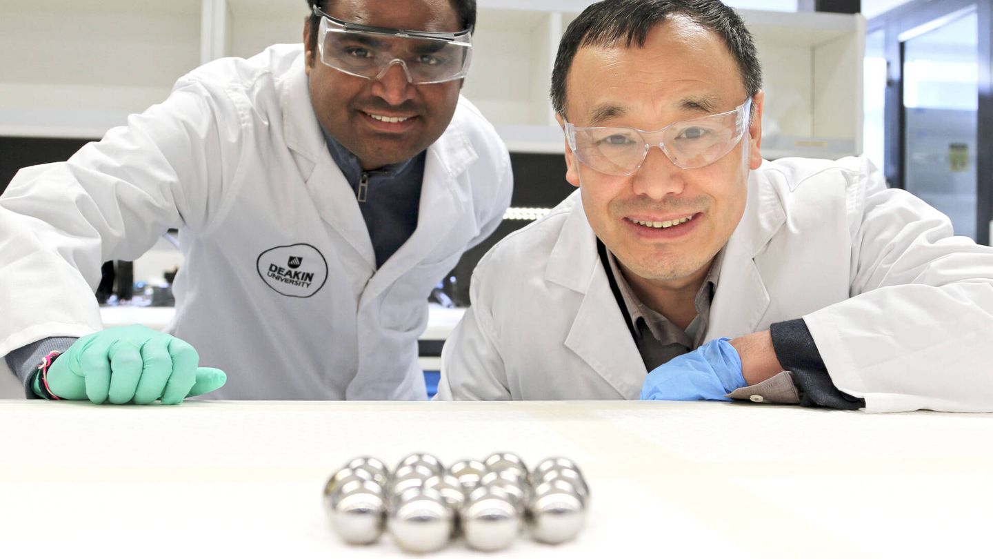 Los investigadores muestran las bolas de acero que usan para moler. (Deakin University)