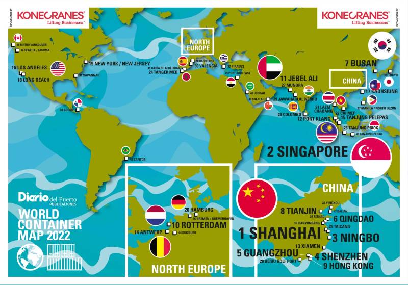 Los 7 puertos chinos del Top 10 fueron Shanghai (1), Ningbo (3), Shenzhen (4), Guangzhou (5), Quingdao (6), Tianjin (8) y Hong Kong (9).