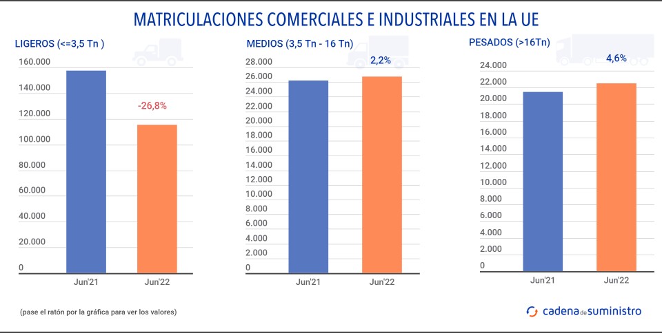 Las matriculaciones de vehículos comerciales e industriales en la Unión Europea se han reducido en un 22,5% en el sexto mes de 2022, con un total de 144.210 unidades, según los datos de la Asociación Europea de Fabricantes de Automóviles, Acea.