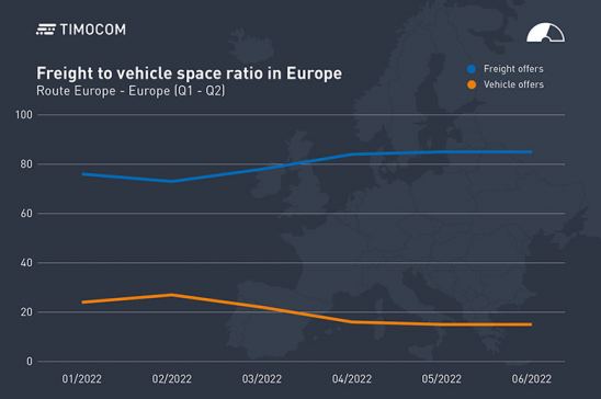 Los cuellos de botella en el transporte alimentan la espiral de precios en Europa. A pesar de la continua escasez de abastecimiento, materias primas y piezas de suministro en producción, la demanda de transportes por carretera sigue siendo alta. Mientras que la demanda continúa subiendo, la falta de camioneros y los cuellos de botella en el sector del transporte inflan la espiral de precios. La relación entre ofertas de cargas y de camiones en Europa está muy descompensada, tal como ha quedado patente en el segundo trimestre.