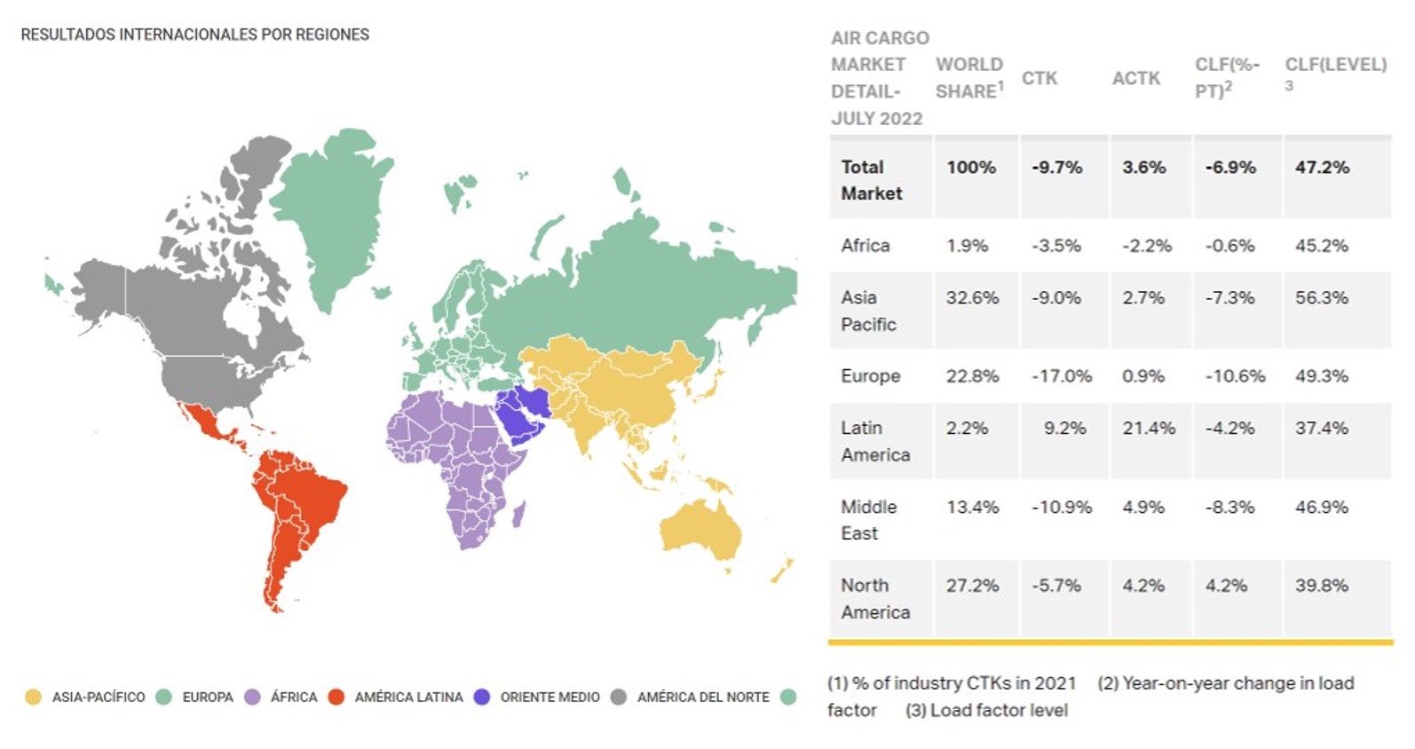 Por regiones, a excepción de las aerolíneas latinoamericanas, el resto de compañías aéreas continúan empeorando sus cifras de demanda. Los volúmenes de carga aérea en Latinoamérica aumentaron el 9,2% en julio respecto al año anterior, en parte por la introducción de nuevos servicios y capacidad (+21,4%), así como del aumento de sus flotas. Al otro lado de la balanza, Europa ha experimentado una caída en su demanda del 17%. La guerra en Ucrania, junto a la reducción de plantillas y de producción industrial en Asia a causa de omicron, han sido las principales razones de su descenso. Las aerolíneas de Oriente Medio no consiguen remontar sus resultados y sus volúmenes de carga aérea disminuyeron el 10,9% en julio, aunque su capacidad aumentó el 21,4% en relación al mismo mes del 2021.