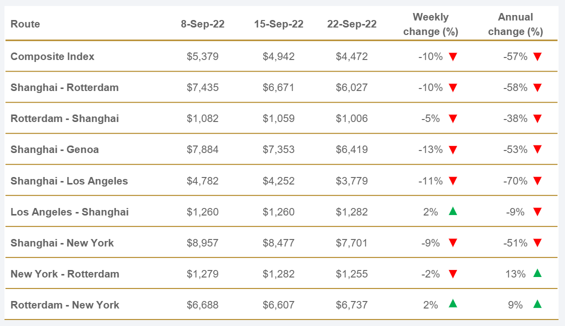 Por su parte, el World Container Index (WCI), que evalúa el coste de los fletes en la principales rutas hacia y desde Estados Unidos, se sitúa en 4.471,99 $ por contenedor de 40 pies, lo que supone un -9,5% en relación a la semana anterior y una bajada del -56,9% con respecto al mismo periodo del año pasado. El índice se encuentra ya un 57% por debajo del pico de 10.377 $, alcanzado en septiembre de 2021, aunque permanece un 21 % más alto que el promedio de 5 años de 3.704 $.
