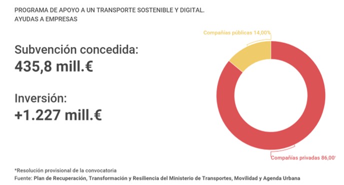 Cabe destacar el peso del sector privado en el reparto de estas subvenciones, ya que el 86% de las compañías que optan a estas cuantías son empresas privadas, frente al 14% que representa el público. En total, el sector privado recibirá 372,9 millones de euros para financiar 83 solicitudes de 61 compañías. Los 62,9 millones de euros restantes se destinarán a las 15 propuestas de ocho entidades públicas. Los fondos europeos cofinanciarán el 35% del coste de estos proyectos, por lo que contribuirán a movilizar hasta 1.227 millones de euros en inversiones, «impulsando la reactivación del tejido productivo y reforzando el compromiso del Gobierno con una actividad fundamental para la transición a una economía menos contaminante y más eficiente y resiliente», según el ministerio.