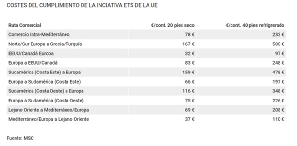 Los clientes de las navieras de línea regular tendrán que afrontar fletes más elevados para transportar sus mercancías a raíz de la inclusión de los buques mercantes en el sistema de comercio de emisiones de dióxido de carbono (ETS) de la UE, lo que obligará a los armadores a entregar derechos de manera gradual a partir de 2023. En concreto, el precio por contenedor podría aumentar hasta 500 euros en algunas de las principales rutas del comercio marítimo internacional, según los cálculos realizados por Mediterranean Shipping Company (MSC), la naviera más grande del mundo con una flota con capacidad para 4,3 millones de teus.