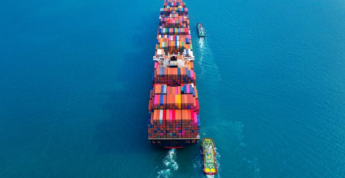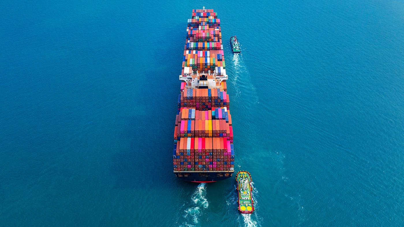 Aerial view of container cargo ship in sea.
