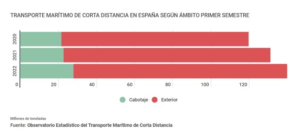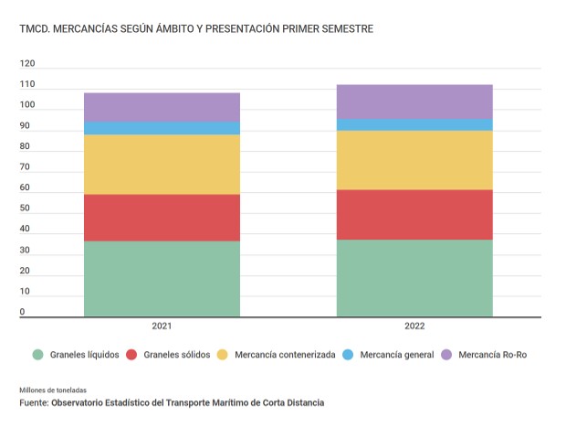 El volumen del transporte marítimo de corta distancia en España ha alcanzado los 140 millones de toneladas en el primer semestre de 2022, lo que ha supuesto un incremento del 6,6% respecto al mismo periodo de 2021. El protagonista de este crecimiento ha sido el movimiento de cabotaje, que ha sido el 22% superior al de los seis primeros meses del pasado ejercicio, según los datos del Observatorio Estadístico del Transporte Marítimo de Corta Distancia de la Asociación Española de Promoción del Transporte Marítimo de Corta Distancia (SPC-Spain). El tráfico exterior ha crecido el 3,4% con respecto al periodo enero junio del año pasado. “El mayor crecimiento ha sido el del tráfico rodado”, ha destacado la asociación, “debido al incremento del cabotaje (20,6%) y del tráfico exterior (17,3%)”.