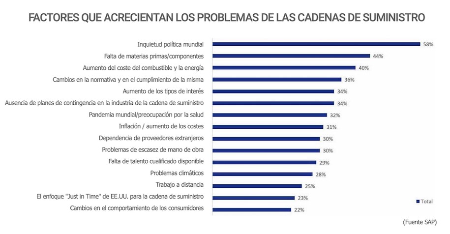 Los principales factores señalados son la inestabilidad política mundial (58%), la falta de materias primas (44%) y el aumento de los costes de combustible y energía (40%). Solo el 31% citó la inflación como una causa importante.