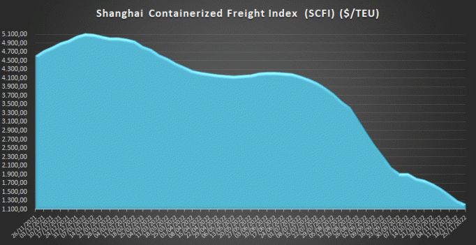 25/11/2022 ACE Con un valor de 1.229,90 $/TEU, los fletes desde Shanghái (SCFI) reflejan hoy un descenso del -5,9 % respecto a la semana anterior y del -73,3 % en…