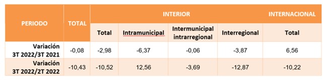 Dentro de la actividad nacional, la mayor bajada se produce en las rutas más cortas intramunicipales (DUM), con un –6,37%, aunque con un crecimiento considerable respecto al trimestre anterior (12,56%).