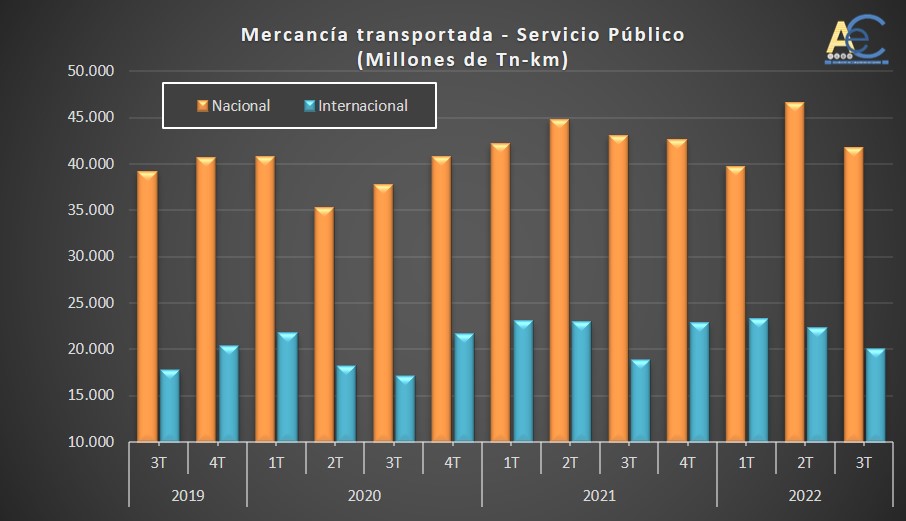 Según recoge la última encuesta permanente del transporte de mercancías por carretera que elabora el Ministerio de Transportes, en el tercer trimestre de 2022 el servicio público ha transportado un total de 61.663 millones de toneladas-kilómetro, un 0,08 % menos que el mismo periodo de 2021 (61.715 millones de toneladas-kilómetro).
