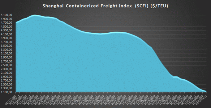Con un valor de 1.171,36 $/TEU, los fletes desde Shanghái (SCFI) reflejan hoy un descenso del -4,8 % respecto a la semana anterior y del -75,2 % en comparación con el mismo periodo de 2021. El índice se encuentra ya un 77% por debajo del pico de 5.109 $, alcanzado en enero de 2022, aunque sigue siendo un 44% más alto que el promedio de 2019 (antes de la pandemia), situado en $ 811.
