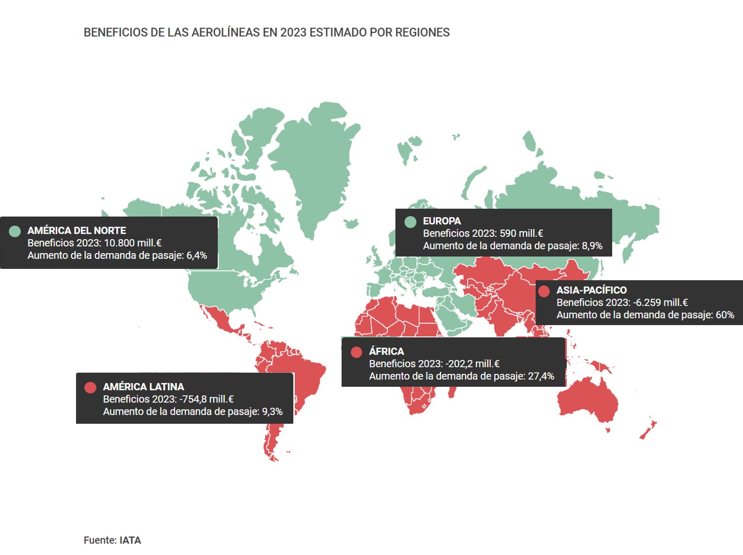En el análisis por zonas geográficas, IATA identifica a las aerolíneas norteamericanas como las únicas que alcanzarán beneficios de forma global en este año 2022. Europa y Oriente Medio, por su parte, también lo conseguirán en 2023, pero el resto “se mantendrán en números rojos”. El hecho de que la región norteamericana haya recibido “menos restricciones a los viajes, y de menor duración” contribuye al impulso de sus operadores, especialmente en cuanto al movimiento de pasajeros. Con un crecimiento de 6,4% de la demanda de este servicio, IATA atribuye un beneficio de 10.800 millones de euros a esta región en 2023, y uno de 9.500 millones de euros en el presente ejercicio. Las aerolíneas europeas seguirán en pérdidas de 3.000 millones de euros en 2022, pero recuperarán 590 millones de euros en el próximo año, con un crecimiento de la demanda de pasaje del 8,9%. Se espera que en Oriente Medio se pierdan 1.043 millones de euros en 2022, pero se obtengan 254,2 millones de euros de beneficio en 2023. La demanda de pasajeros para esta región se dispararía el 23,4% en el próximo ejercicio, según las previsiones de las aerolíneas.