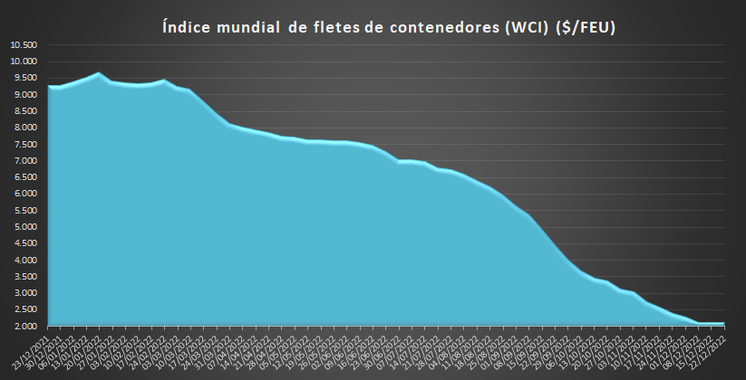 Por su parte, el World Container Index (WCI), que evalúa el coste de los fletes en la principales rutas hacia y desde Estados Unidos, se sitúa en 2.119,9 $ por contenedor de 40 pies, lo que supone un -0,3% en relación a la semana anterior y una bajada del -77 % con respecto al mismo periodo del año pasado. El índice se encuentra ya un 80% por debajo del pico de 10.377 $, alcanzado en septiembre de 2021. Es un 21 % más bajo que el promedio de los últimos 10 años de 2.693 $, lo que indica un retorno a precios más normales, aunque sigue siendo un 49% más alto que el promedio de 2019 (antes de la pandemia) situado en $ 1.420.