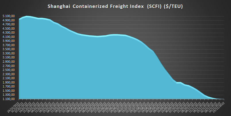 Con un valor de 1.107,09 $/TEU, los fletes desde Shanghái (SCFI) reflejan hoy un descenso del -1,4 % respecto a la semana anterior y del -77,6 % en comparación con el mismo periodo de 2021. El índice se encuentra ya un 78% por debajo del pico de 5.109 $, alcanzado en enero de 2022, aunque sigue siendo un 36,5% más alto que el promedio de 2019 (antes de la pandemia), situado en $ 811.